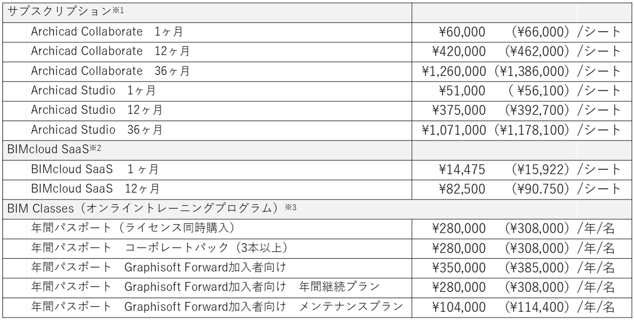 ※1 サブスクリプションには、「Graphisoft Forward(サポートサービス)」およびBIM Classesの受講価格の割引の適用が含まれます。