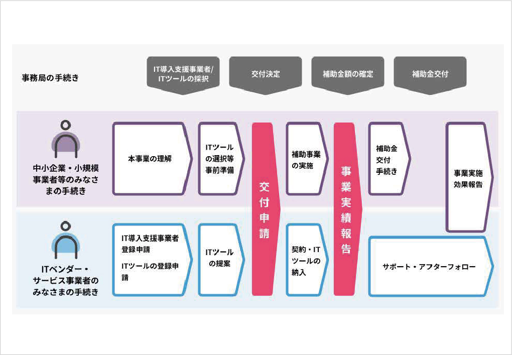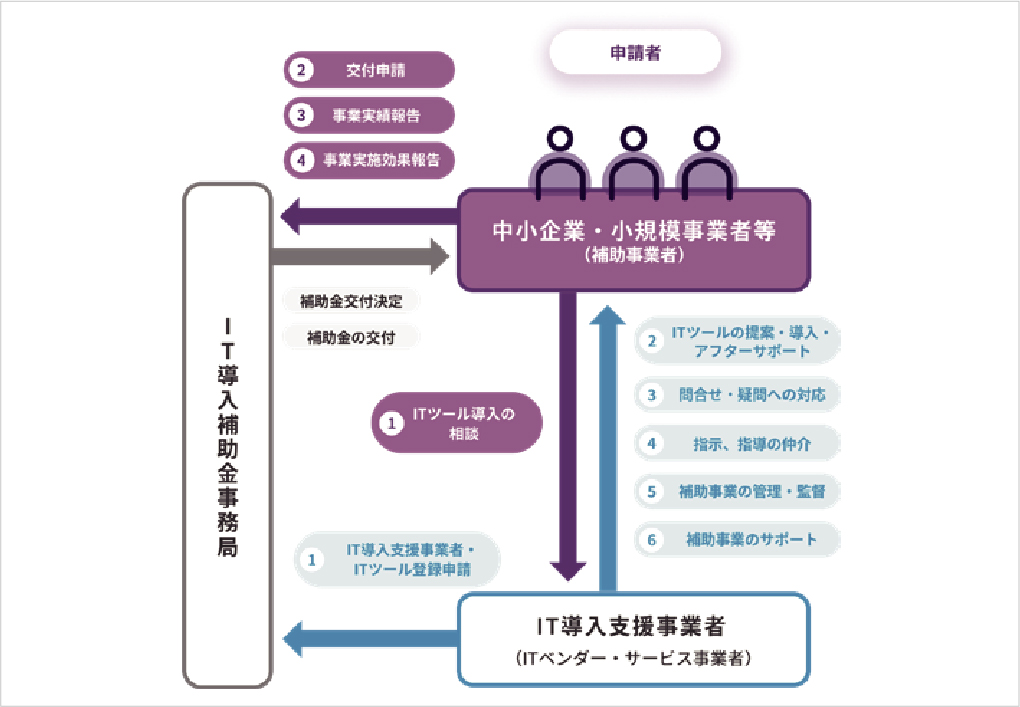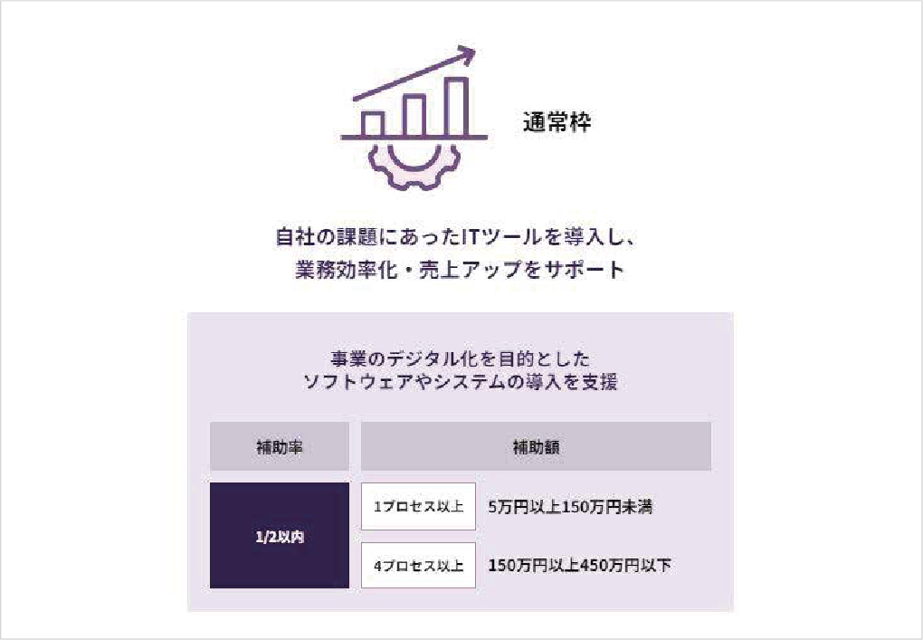 IT導入補助金は、中小企業・小規模事業者等の労働生産性の向上を目的として、業務効率化やDX等に向けた ITツール(ソフトウェア、サービス等)の導入を支援する補助金です。