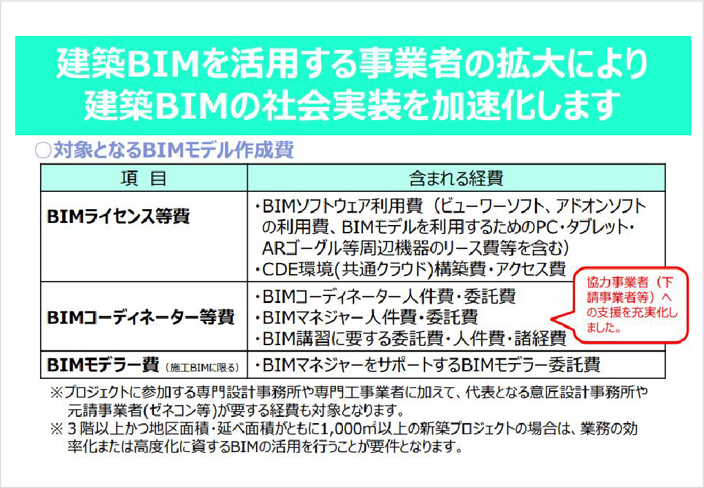 対象経費となるのは、BIMソフトウェア等費用、BIM講習費用、CDE環境(共通クラウド)費用、BIMコーディネーター費用(環境整備・技術支援)、BIMマネジャー費用(調整・コントロール)、BIMモデラ―費用(モデル統合・調整/施工BIMに限る)で、協力会社のBIMソフトウェア等費用、BIM講習費用等も対象です。